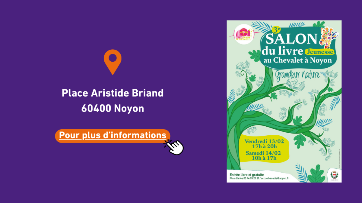 Dans le cadre du festival des Culottes courtes, la Médiathèque du Chevalet vous convie à son Salon du livre qui sera cette année Grandeur Nature. Nous vous donnons rendez-vous dans la salle de réception du Chevalet, vendredi 13 février de 17h à 20h et samedi 14 février de 10h à 17h, en présence des librairies Dallongeville de Noyon, Pages d’Encre d’Amiens et Christel de l’Ecole des Loisirs.